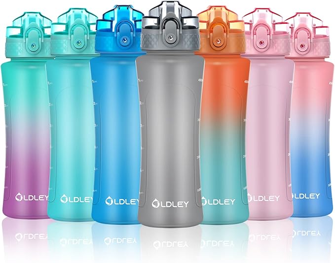 OLDLEY Kids Water Bottle with Straw 15 oz BPA-Free Leak-Proof Motivational Water Bottles with Time Marker for School Sports Travel Gym, Easy to Use for Girls Goys, 1 Straw Lid, Grey