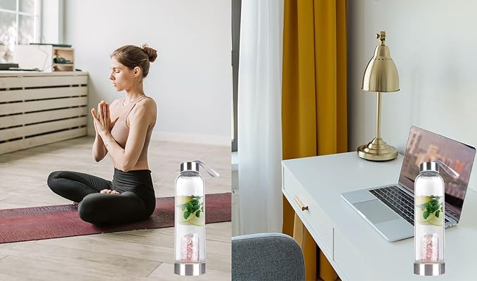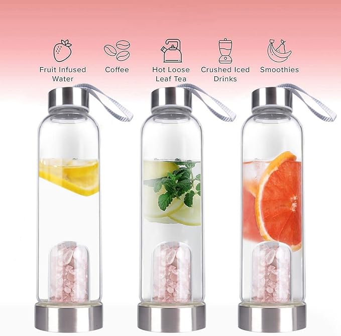 - Split Crystal Chamber For Easy Swapping: No pre-installed crystals or poorly designed chambers, here! YOU choose what crystals to use in the glass water bottle and can easily swap them out any time you’re in the mood for a change in energy. Just open the included bag of quartz crystals, unscrew the bottom stainless steel cap, pour into the infusion chamber and re-tighten. No worrying about leaks or unsanitary drinking conditions from direct contact (ick)!