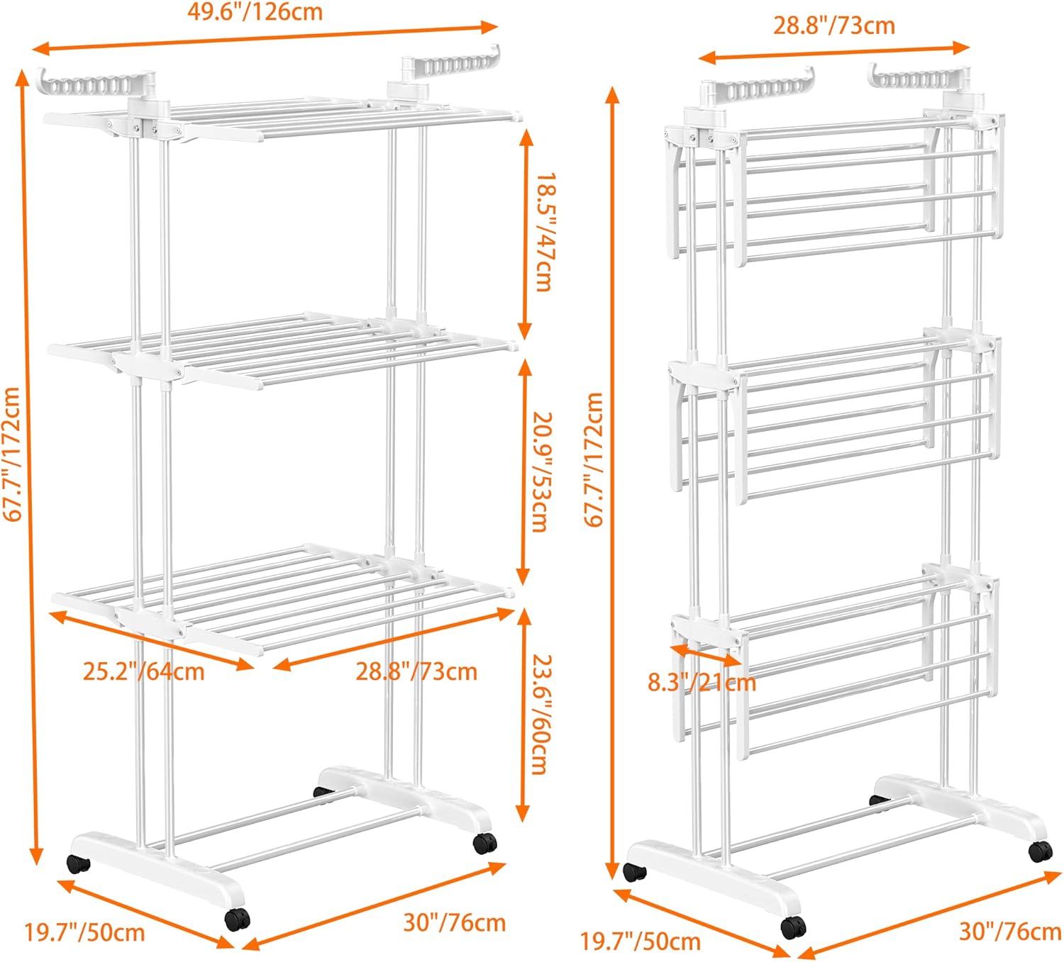 - 【4-TIER Oversized Clothes Drying Rack】: Size: 67.7H x 19.7W x 30L Inches. Oversized 4-tier design and 2 wing hooks for drying towels, socks, clothes, shoes, quilts, etc. There are a total of 24 pillars, 14 hooks on 2 side wings for additional hanging drying. Oversized drying rack for drying up to 62 clothes. There is enough space to dry whole family's clothes.