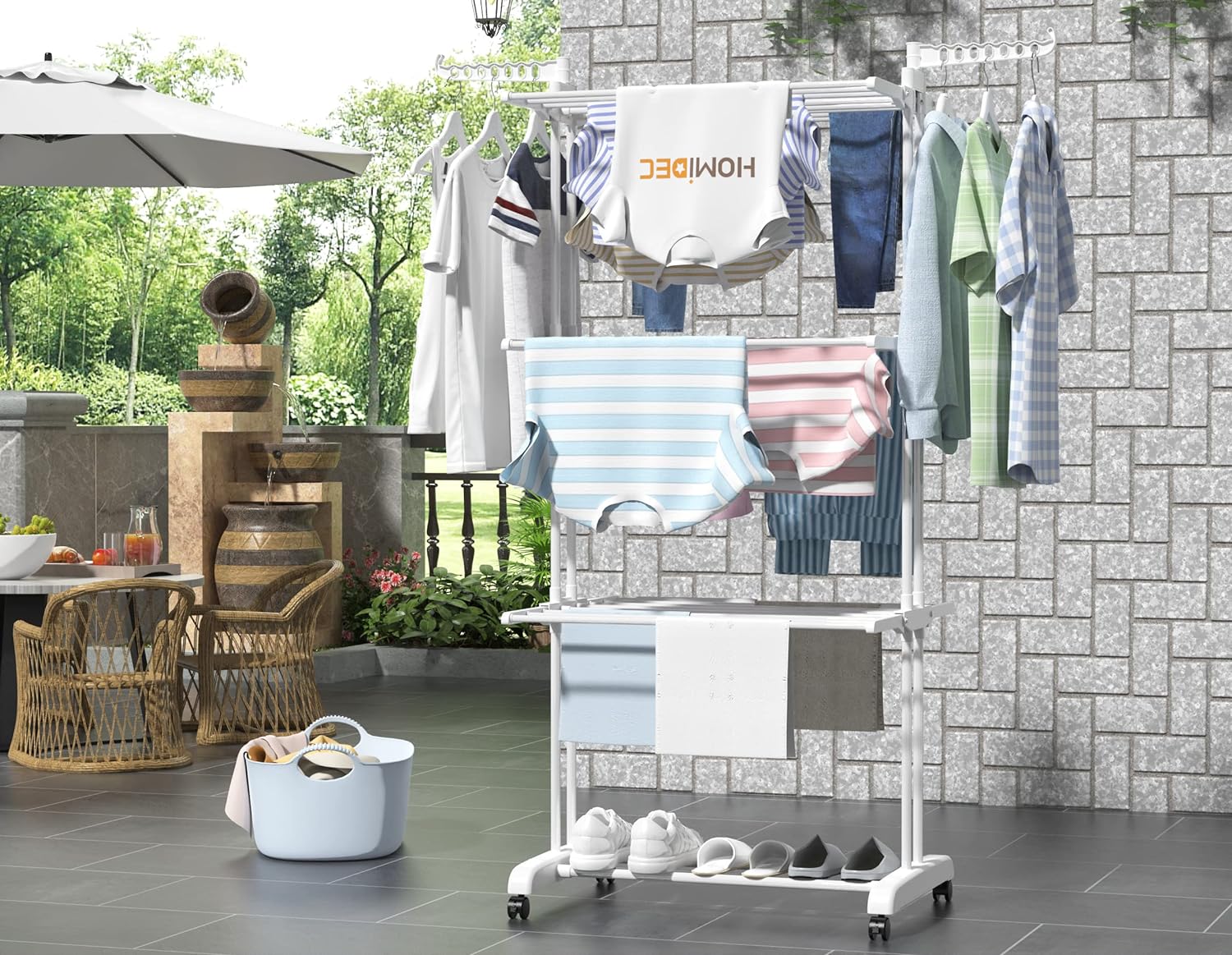 - 【Wide Application Scenarios】: This drying rack is suitable for indoor or outdoor use. You can put it on a balcony, patio, laundry room, or hallway. It can be used to store clothes, and the bottom layer can store shoes, When you are not using it, it can be folded to save space.