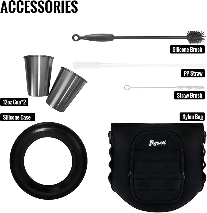 - Safe Material: Skywell 1 gallon stainless steel water bottle is built with 18/8 stainless steel that's BPA-free. Lid and straw of the water flask is material of PP, brush and bottom case are silicone, and the carrying pouch is made of sturdy Oxford cloth. This insulated water bottle also comes with two 18/8 stainless steel 12oz reusable cups which are large enough for a standard beer.