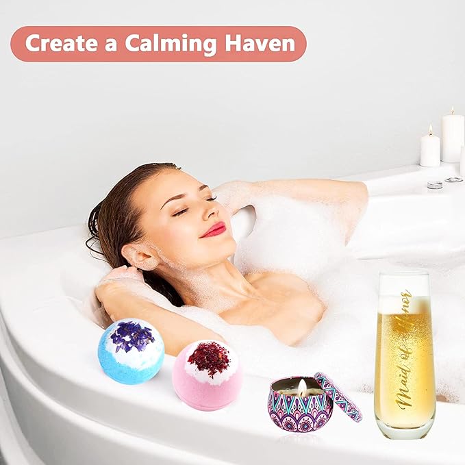 - Perfect Maid Of Honor Gift Box: This maid of honor proposal gifts is a simple perfect gift for your Maid Of Honor . Ask “Will you be my Maid Of Honor?” Package include:1xstemless champagne flutes,1x necklace in a jewelry box,1x rose gold bangle,2x silk hair rings,A pair of bridesmaid socks,2x bath sall balls,1x Lavender candle ,1x bridesmaid card