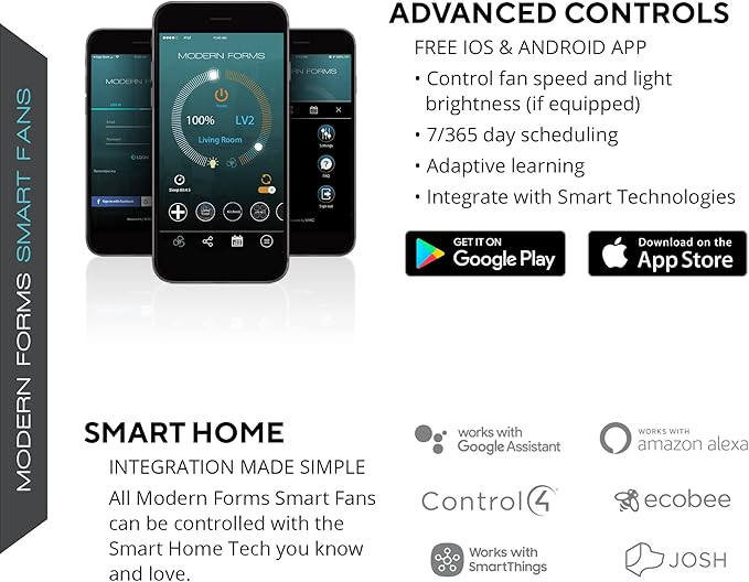 - SMART: Modern Forms Fans pair with the smart home tech you know and love, including Google Assistant, Amazon Alexa, Samsung Smart Things, Ecobee, Control4, and Josh AI. Control on iOS or Android through the Modern Forms App.