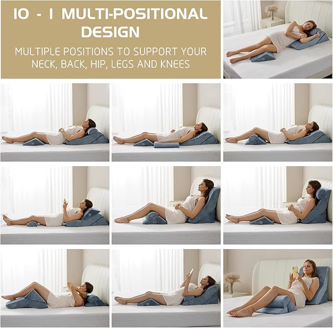 - THE NEWLY DESIGNED 4-PIECE WEDGE SYSTEM: The most advanced & developed wedge pillow set with an ergonomic curve design. Perfect for providing you with an exceptionally comfortable posture when reading, surfing the Internet, during pregnancy, during deep sleep, and during leg discomfort.