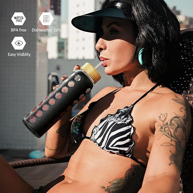 - GLASS WATER BOTTLES WITH TIME MARKER:MUKOKO 24oz glass water bottle with time marker preserves the purity of water.This is a very handy way to keep up with my water intake,stay hydrated and healthy.