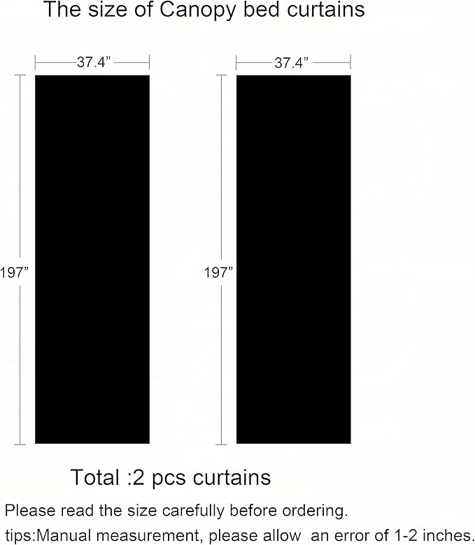 - Size detail:37.4" X197" each curtain. This bed drapes canopy curtain scarf is suitable for all bed sizes.Pls check you bed or bed frame dimension before you buy.You could use for frame bed, house bed,carrige bed.Put in baby nursery room,girls bedroom,boho style room,etc.