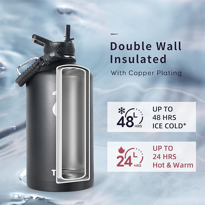 Trebo One Gallon Water Bottle Insulated with Paracord Handle,128oz Food-grade Double Wall Vacuum Stainless Steel Insulated Jug with Straw Spout Handle Lids, Leakproof Keep Cold & Hot,Black