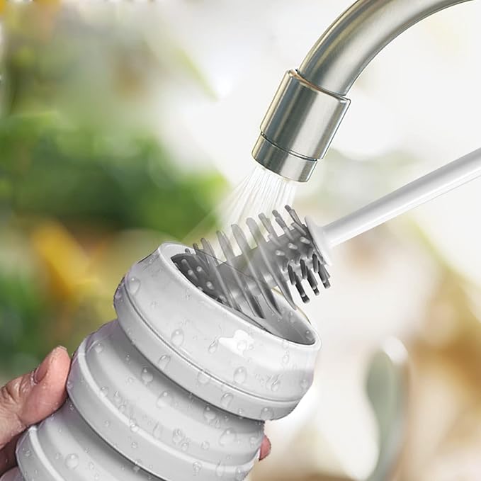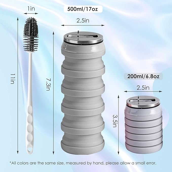 - 👉🏼【SET INCLUDES】: Set includes 1-pack of collapsible water bottles and a silicone brush, made of food-grade silicone BPA Free, 500ml/17oz.Only 3.5 inches when folded, 200ml/7oz. Portable and easier to store.
