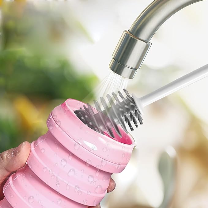 BeHeSo Collapsible Water Bottles with Silicone Brush - Straw Silicone Foldable Water Bottle Reusable Camping Cup Leak Proof Portable Travel Sport Water Bottle-500ml/17oz (Pink)