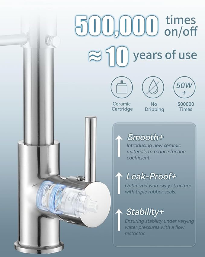 - 【EASY MAINTENANCE】Lead-free solid brass body and commercial SUS 304 stainless steel spring construction forged products. Nickel Brushed surface treatment added 18/8 Chromium/Nickel content provides a superior anti-corrosion and anti-rust finish that prevents dirt such as fingerprints or water stains from adhering to the faucet surface, making the kitchen look cleaner. Daily cleaning with a cloth or water is enough, less time cleaning and more time having fun with your family.