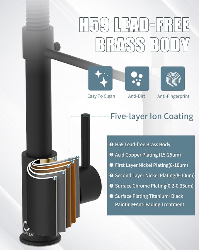 - 【EASY MAINTENANCE】Lead-free solid brass body and commercial SUS 304 stainless steel spring construction forged products. Matte Black surface treatment added 18/8 Chromium/Nickel content provides a superior anti-corrosion and anti-rust finish that prevents dirt such as fingerprints or water stains from adhering to the faucet surface, making the kitchen look cleaner. Daily cleaning with a cloth or water is enough, less time cleaning and more time having fun with your family.