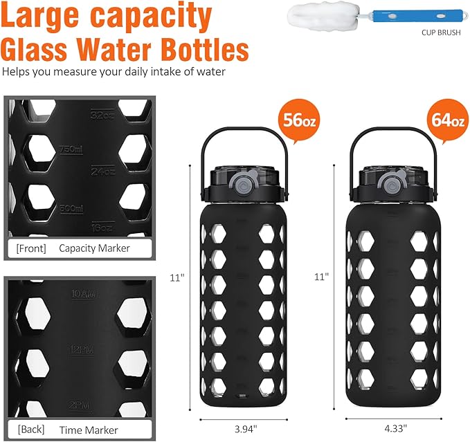 MUKOKO Half Gallon/64 oz Glass Water Bottles with Straw and Lid,Motivational Water Jug with Time Marker Reminder and Silicone Sleeve,100% Leakproof BPA Free Fitness Sports Large Bottle-Black