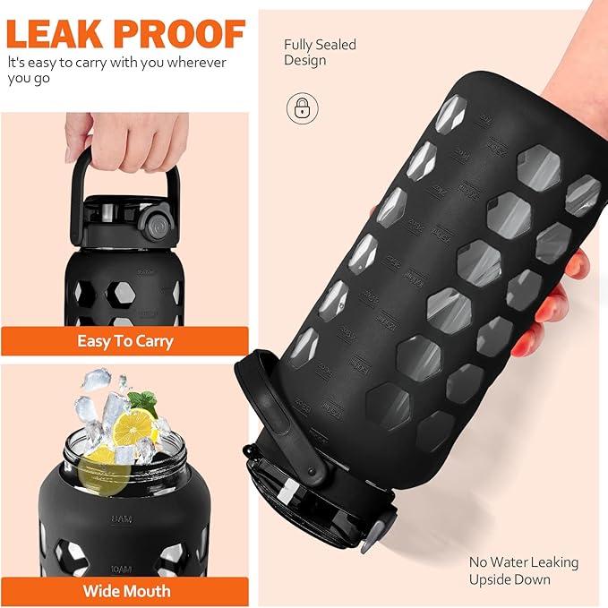 MUKOKO 56oz Glass Water Bottles with Straw and Lid,Motivational Water Jug with Time Marker Reminder and Silicone Sleeve,100% Leakproof BPA Free Fitness Sports Large Bottle-Black