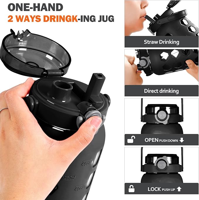 - BPA Free & Convenient Design: This large water bottle is 100% BPA FREE, odor free and healthy for your daily water drinking. The dust free cap with a seal ring makes it 100% leakproof. It has a one removable straw that allows you to enjoy spill-proof sipping. It can also be used without the straw, a dual-purpose water bottle.