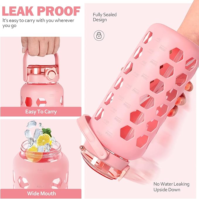 MUKOKO Half Gallon/64 oz Glass Water Bottles with Straw and Lid,Motivational Water Jug with Time Marker Reminder and Silicone Sleeve,100% Leakproof BPA Free Fitness Sports Large Bottle-Pink