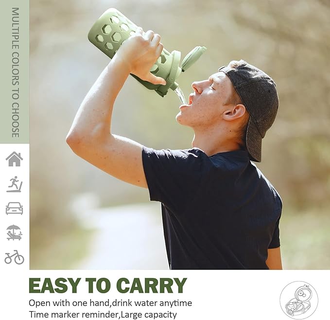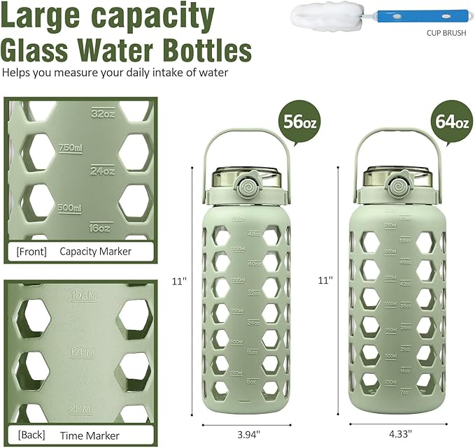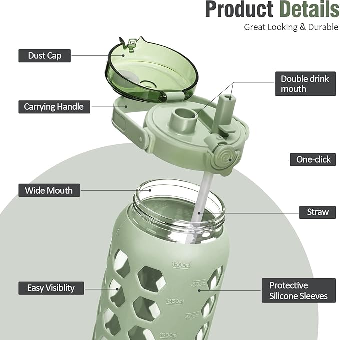 - Exact Volume & Time Marker: This glass water bottle is great for measuring your daily intake of water, reminding you to stay hydrated and drink enough water throughout the day. It has exact volume and time markers.