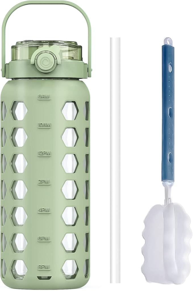 MUKOKO 56oz Glass Water Bottles with Straw and Lid,Motivational Water Jug with Time Marker Reminder and Silicone Sleeve,100% Leakproof BPA Free Fitness Sports Large Bottle-Green