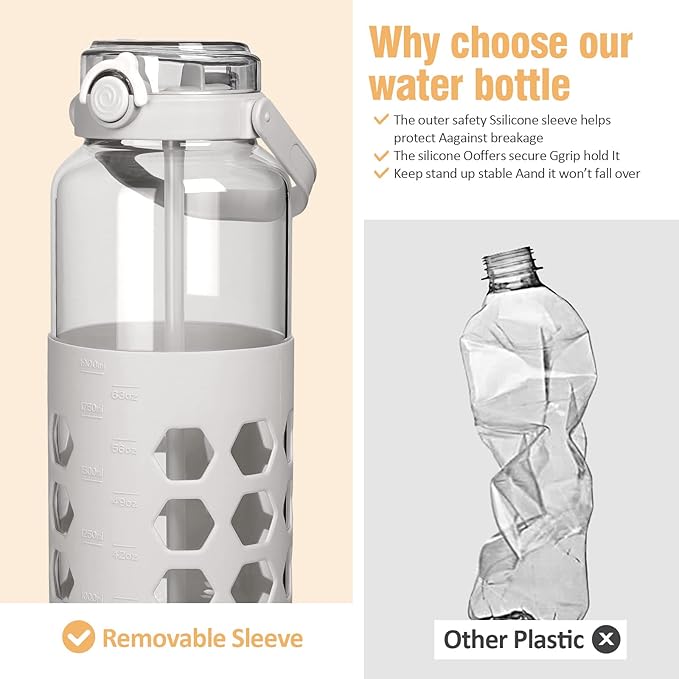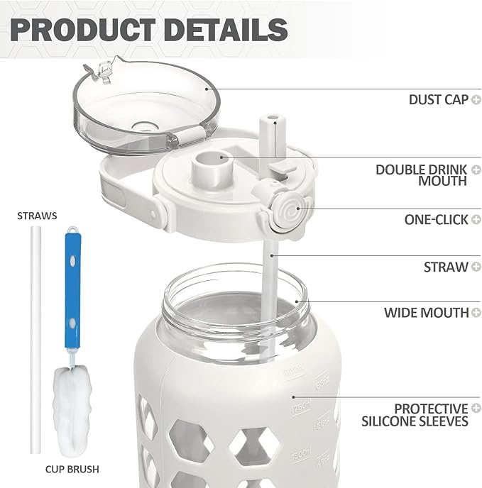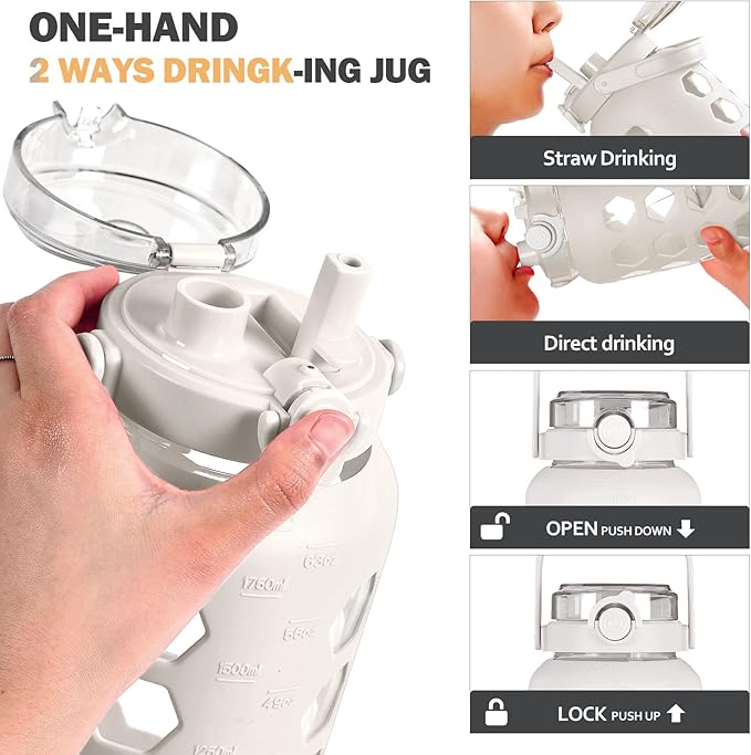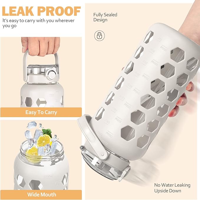 MUKOKO Half Gallon/64 oz Glass Water Bottles with Straw and Lid,Motivational Water Jug with Time Marker Reminder and Silicone Sleeve,100% Leakproof BPA Free Fitness Sports Large Bottle-White