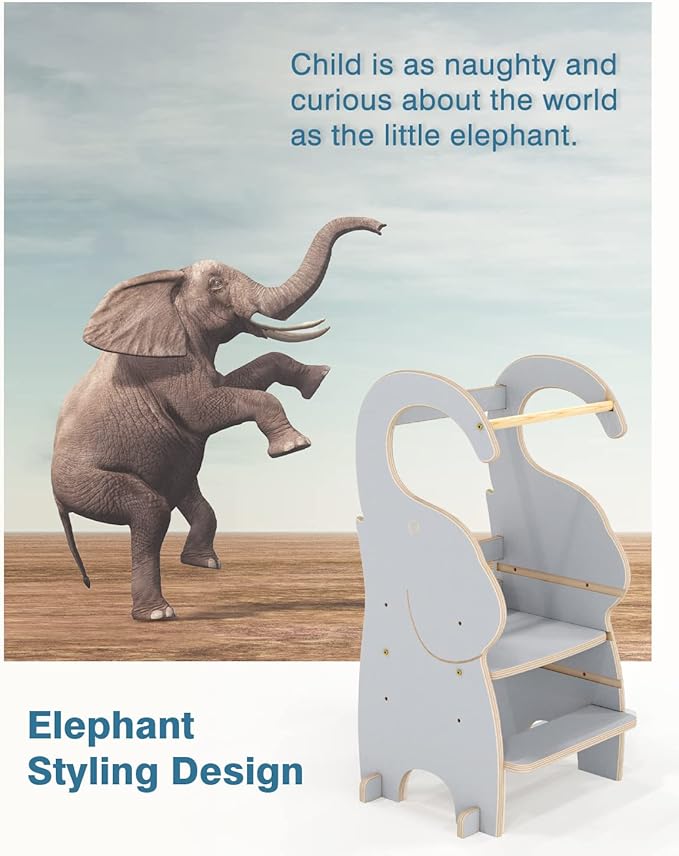 PP OPOUNT Toddler Kitchen Stool, 3-Level Adjustable Toddler Tower, Wood Step Stools for Kids with Safety Protective Net and Non-Slip Mat, Elephant Style, Solid Wood Gray
