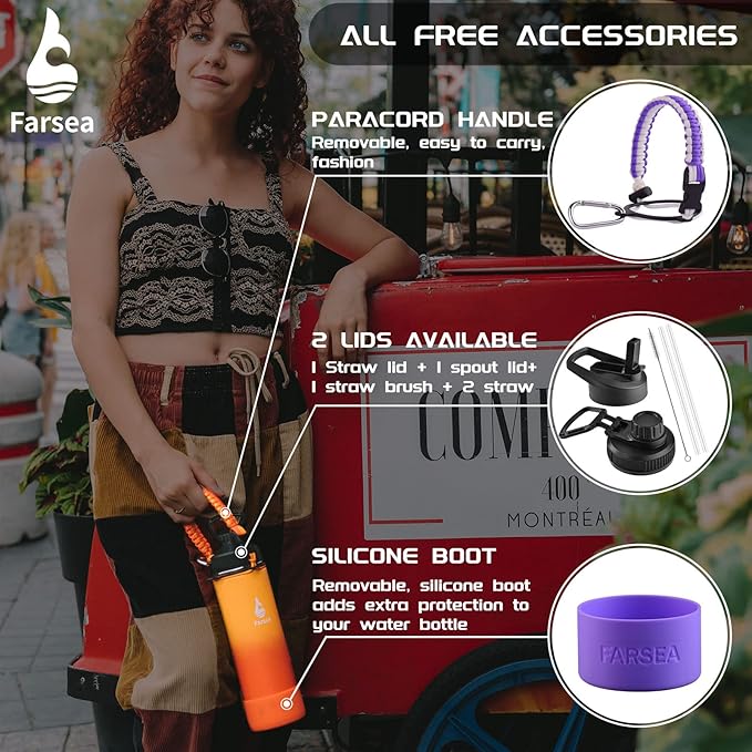 - WHAT YOU'LL GET: Farsea is committed to providing the best value and highest quality to the customers; We offer Continuous After-sales Service and Solve All Problems; We offer several different capacity bottles(12 oz, 18oz, 24 oz, 32 oz, 40oz) and you can choose according to your needs; Package: Comes with 2 lids (Straw lid & Spout Lid), paracord holder, protective Silicone Boot, nice packing box, 2 straws, and straw brush
