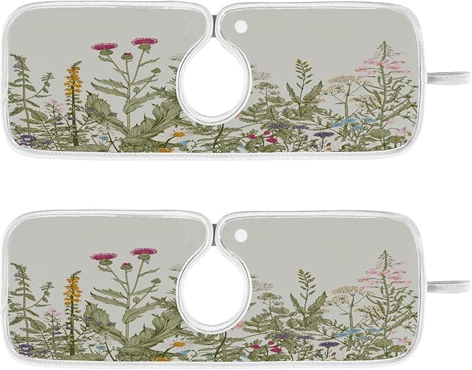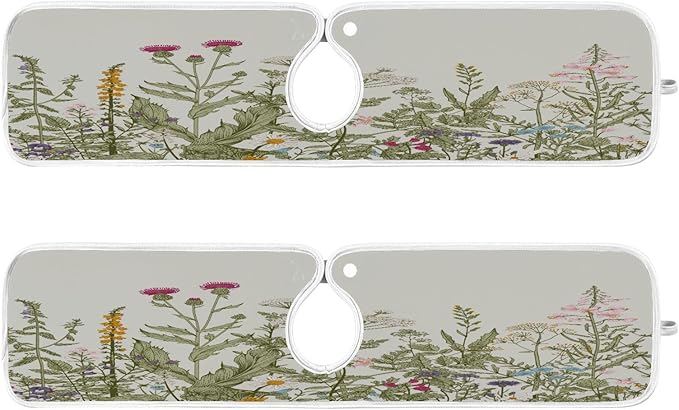 Kitchen Faucet Absorbent Mat, Herbs Wild Flowers Plant Water Splash Guard for Sink, Faucet Drip Catcher Thicken Sponge Microfiber Faucet Water Catcher Mat Sink Absorbent Mat for Kitchen 23x5in 2 Pack
