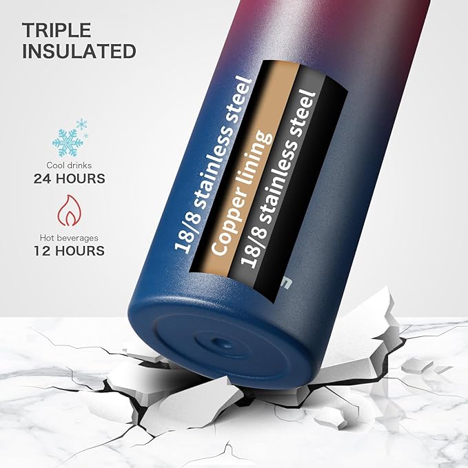 - TRIPLE INSULATION: Stainless steel water bottles with Triple-insulation technology,2 stainless steel walls enclosing an inner copper, this keeps the insulated water bottle 32 oz Cold up to 24+ hours and Hot up to 12 hours, which also can reduce the condensation effectively. Insulated water bottles ensures you have a cool drink after exercise in summer or enjoy warm coffee outdoor in winter.