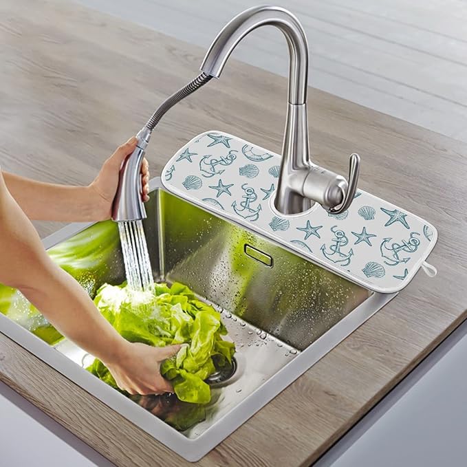 Coastal Starfish Shell Faucet Water Catcher Mat 2 Pack Seashell Ocean Nautical Theme Drying Mat Absorbent Bathroom Faucet Handle Drip Catcher Tray Bar RV Kitchen Sink Splash Guard 30x5 Inches