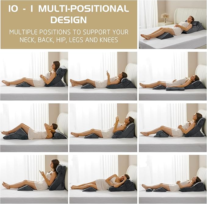 - THE NEWLY DESIGNED 4-PIECE WEDGE SYSTEM: The most advanced & developed wedge pillow set with an ergonomic curve design. Perfect for providing you with an exceptionally comfortable posture when reading, surfing the Internet, during pregnancy, during deep sleep, and during leg discomfort.