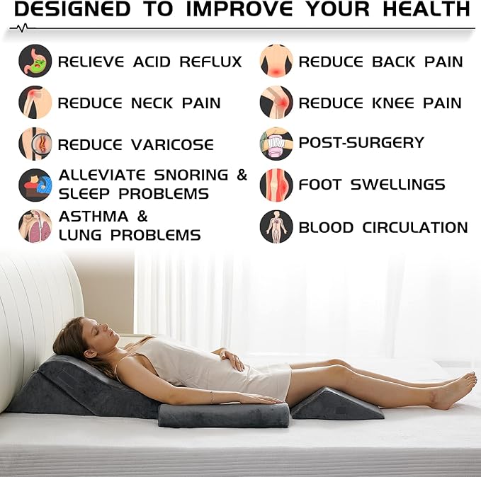 - DESIGNED FOR GERD, HEARTBURN, ACID REFLUX, AND OTHER MEDICAL CONDITIONS: Support your back and shoulders through the bed wedge pillow to improve your sleep posture, reduce neck pain and promote breathing.