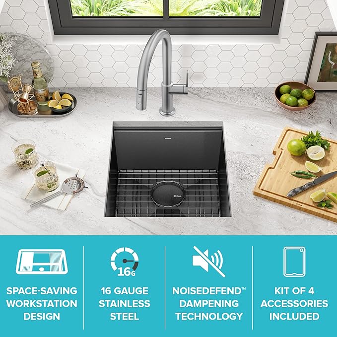 - INSTALLATION-READY with all mounting hardware and cut-out template for simple installation – EASY TO CLEAN rounded corners on sink bottom help reduce buildup over time – Straight walls maximize usable workspace – Experience Kraus Quality with top-rated customer service – Enhance the functionality of your sink with RECOMMENDED ACCESSORIES (sold separately): Garbage disposal KWD100-75MBL, self-draining silicone drying mat (KDM-10), and expandable kitchen sink caddy (KCD-1/KCD-2)