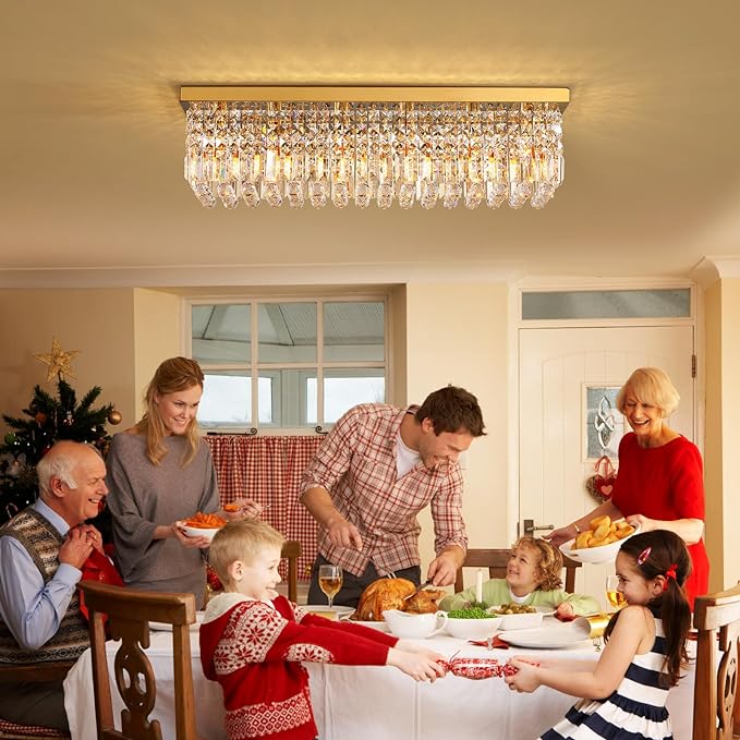 - â¨ăLuxury Gold Crystal Chandelieră: Luxury rectangular chandelier in elegant raindrop design combines modern & minimalist elements, which delivers a superior & high-class ambiance in any spaces. Perfectly matches many decoration styles like modern, classic, farmhouse, industrial, nordic, etc. Suitable for dining room, living room, kitchen island, hallway, entryway, bathroom, bedroom, etc.