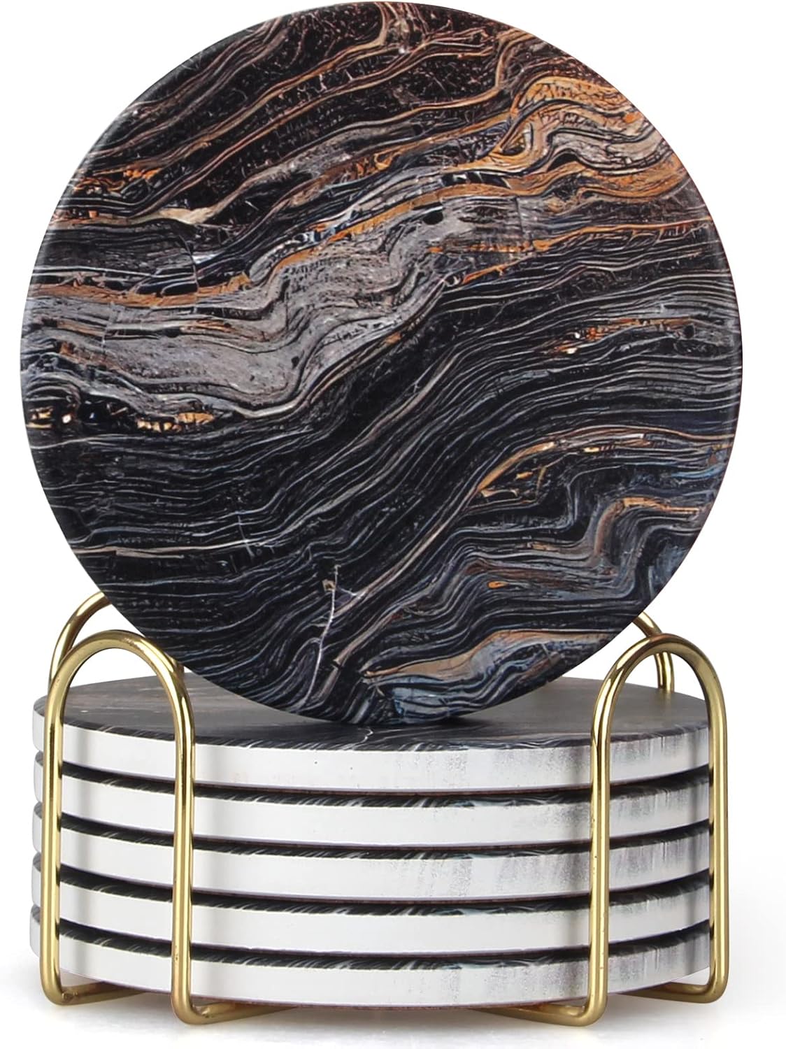 - Convenient for storage: You don't need to bear coasters placed everywhere. Stack nicely in the gold metal holder when not in use and is nicely organized in the metal holder, which will make your home tidier.