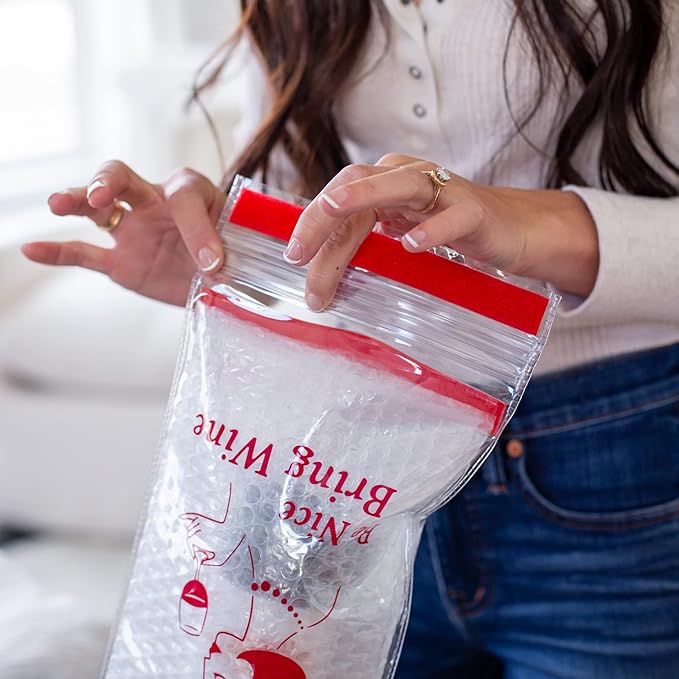 - SMASHPROOF: The outer layer of these 6 wine bags for travel are made from thick industrial anti-cut plastic and is 2 bubble layers thick on each side! But not any old bubble wrap, we use a round bubble in our QUADLayer for the ultimate cush, and best for pressurized luggage holds. Notice the sealed edge? Unlike some bags that are glued, ours are heat-stamped plastic fusion that can’t tear apart and leak.