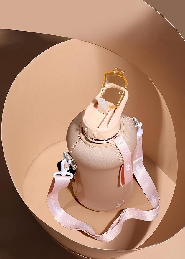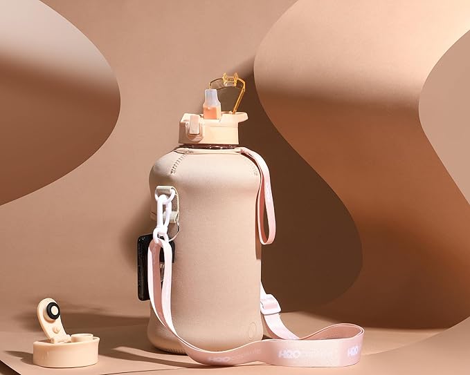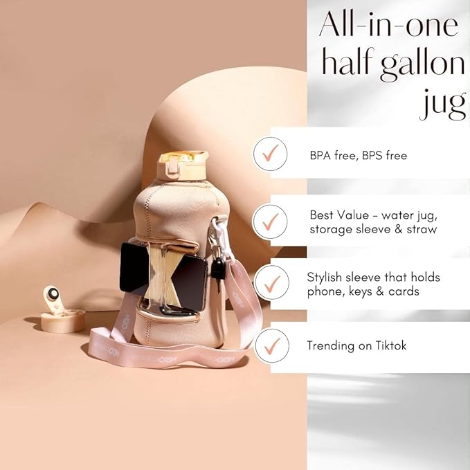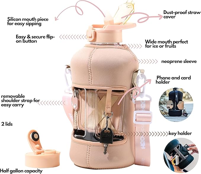 - UNIQUE STORAGE SLEEVE: Using the space under the large jug handle to store your stuff, the patent-pending removable thermal sleeve has a unique design that holds your cards and cell phone, and is finished with an in-built key chain and removable shoulder strap for convenient hands free carrying! It’s the only encased water jug that holds your things while you exercise.