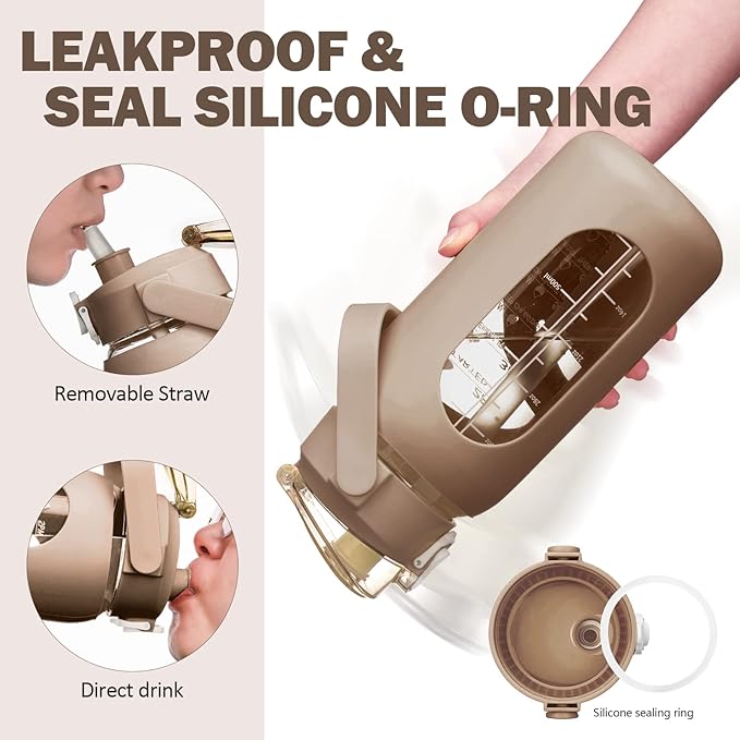 - ❤High-Quality Borosilicate Glass Bottle- This large motivationla water bottle is made of odorless, quality, borosilicate glass. Straw and lid are made of food-grade PP, BPA-free and eco-friendly.