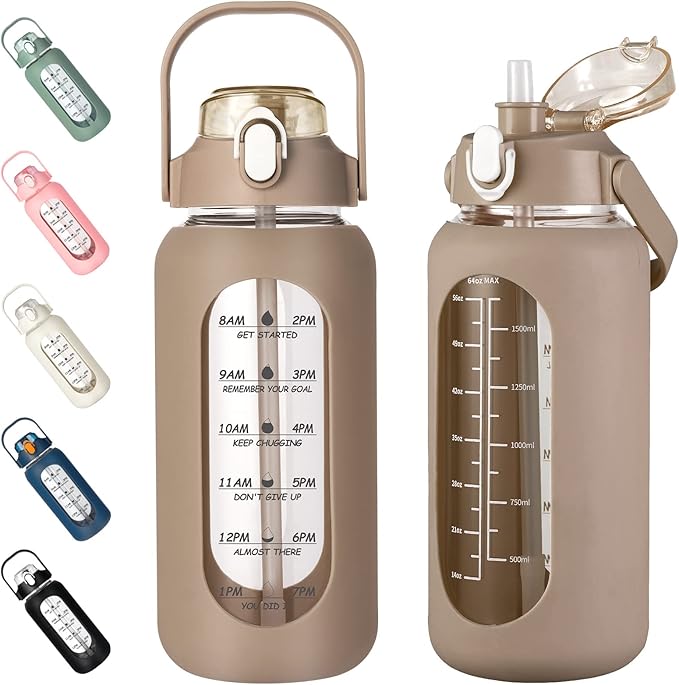 kytffu 64oz Glass Water Bottles with Straw, Half Gallon Motivational Glass Bottle with Silicone Sleeve and Time Marker, 2L Leakproof Large Glass Water Jug for Gym Home Office,Amber