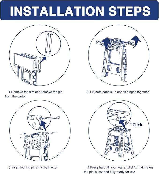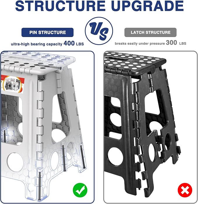 - 【Loads up to 400lbs】ACSTEP pin structure stool is patented. Folding step stool has been reinforced with locking pins and fixed hinges to prevent danger of falling off and enhance stability and bearing capacity effectively.
