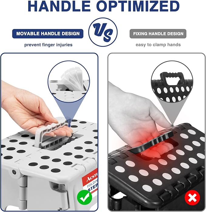 - 【Moving handle design】Differ from the common semi-fixed handle,our 2023 new type collapsible stool is equipped with moving handle,which can prevent injuries during folding/unfolding.
