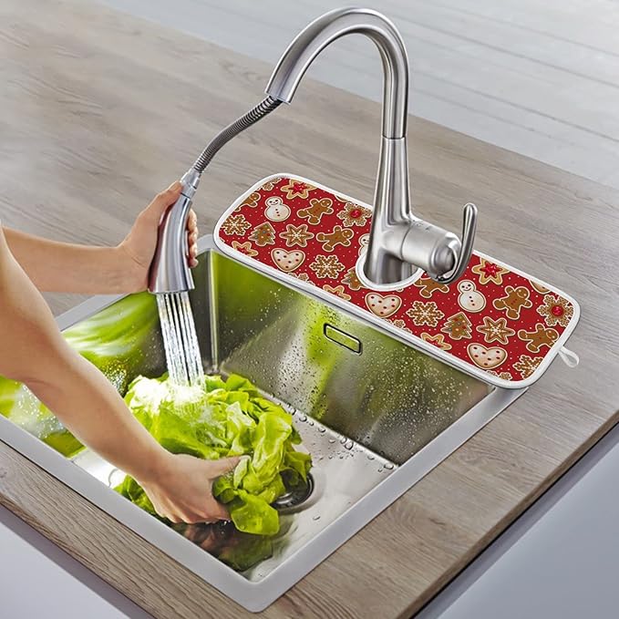 Christmas Red Gingerbread Man Faucet Sink Mat for Kitchen 2 Pack Winter Snowflake Xmas Tree Bathroom Drying Mat Absorbent Splash Water Catcher Mats Microfiber Cloth Drip Protector Splash Pad 14x5
