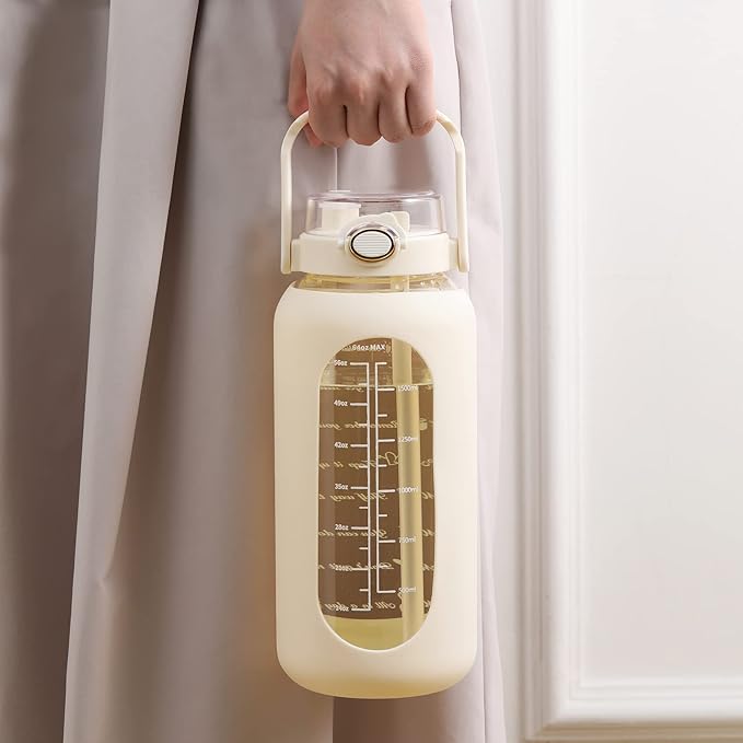 - Glass Water Bottles With Time Marker : The motivational glass water bottles with straw holds 42-64 oz water that is equivalent to 8 cups of water that suggest by scientists for human drink per day, allows you not to refill it frequently anymore. With unique inspiration quotes & time marker & capacity scale, the 64 oz water bottle with carry handle is great for measuring your daily intake of water, helps you stay hydrated and drink enough all day