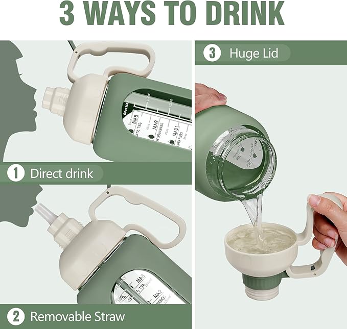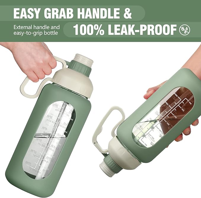 - UNIQUE HANDLE DESIGN&PORTABLE-The 64 oz glass water bottle with sturdy wide handle, the handle size fits your hand perfectly. A dual-purpose water bottle has removable straw that can be used for fast water flow or spill-proof sipping. Our dustproof and leakproof flip-top cap can better keep clean, ensuring you drink healthy.