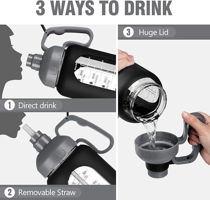 - UNIQUE HANDLE DESIGN&PORTABLE-The 64 oz glass water bottle with sturdy wide handle, the handle size fits your hand perfectly. A dual-purpose water bottle has removable straw that can be used for fast water flow or spill-proof sipping. Our dustproof and leakproof flip-top cap can better keep clean, ensuring you drink healthy.