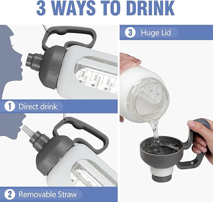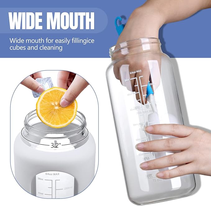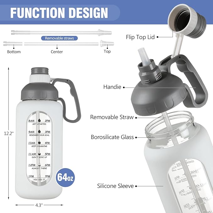 - UNIQUE HANDLE DESIGN&PORTABLE-The 64 oz glass water bottle with sturdy wide handle, the handle size fits your hand perfectly. A dual-purpose water bottle has removable straw that can be used for fast water flow or spill-proof sipping. Our dustproof and leakproof flip-top cap can better keep clean, ensuring you drink healthy.