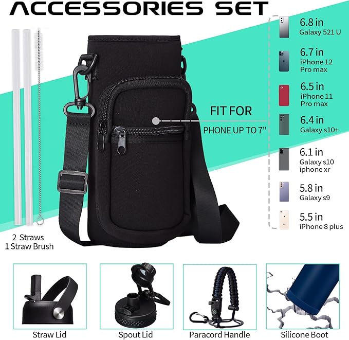 - COMBO—Super Deal: Buy 40oz stainless steel water bottles and get 9 accessories (2 x lids, 1 x survival paracord, 1 x carrying pouch, 1 x shoulder strap, 1 x protective cup mat, 2 x straws, 1 x straw brush). WITH A LIFETIME GUARANTEE, these thermal water bottles are the perfect gift for use at home, work, school, road trips, hiking, sporting events, or just hanging out