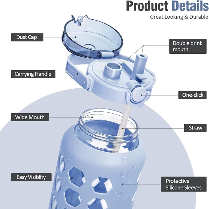 MUKOKO Half Gallon/64 oz Glass Water Bottles with Straw and Lid,Motivational Water Jug with Time Marker Reminder and Silicone Sleeve,100% Leakproof BPA Free Fitness Sports Large Bottle-Light Blue