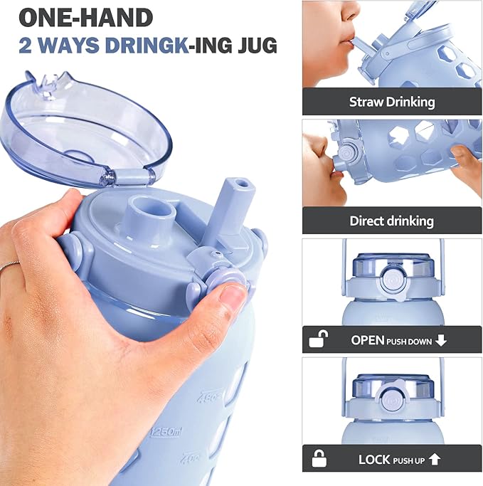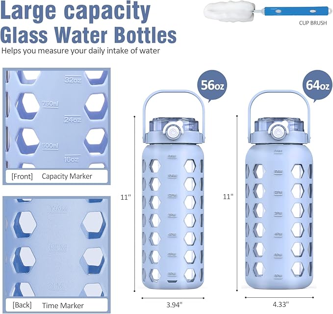 MUKOKO 56oz Glass Water Bottles with Straw and Lid,Motivational Water Jug with Time Marker Reminder and Silicone Sleeve,100% Leakproof BPA Free Fitness Sports Large Bottle-Light Blue