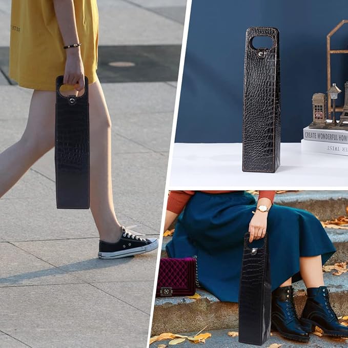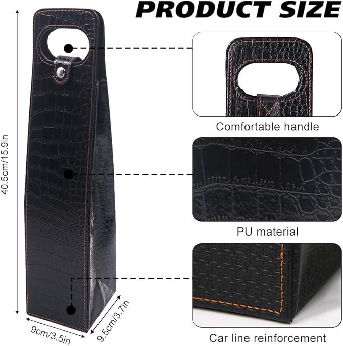 - 【Proper Size】Our PU leather wine carrier measures 4'' × 4'' × 16'' (L × W × H), perfect for a single 750ml bottle of wine, champagne or craft beer. Also suitable for other types of bottle as long as the sizes match.