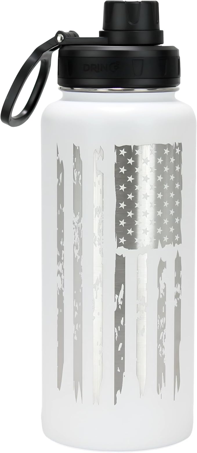 DRINCO Stainless Steel Water Bottle Spout Lid Vacuum Insulated Double Wall Water Bottle Wide Mouth Leak Proof Keep Cold Sport Camping (USA Flag) (32oz Artic White USA Flag, 32oz)
