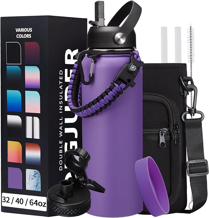 - COMBO—Super Deal: Buy 40oz stainless steel water bottles and get 9 accessories (2 x lids, 1 x survival paracord, 1 x carrying pouch, 1 x shoulder strap, 1 x protective cup mat, 2 x straws, 1 x straw brush). WITH A LIFETIME GUARANTEE, these thermal water bottles are the perfect gift for use at home, work, school, road trips, hiking, sporting events, or just hanging out