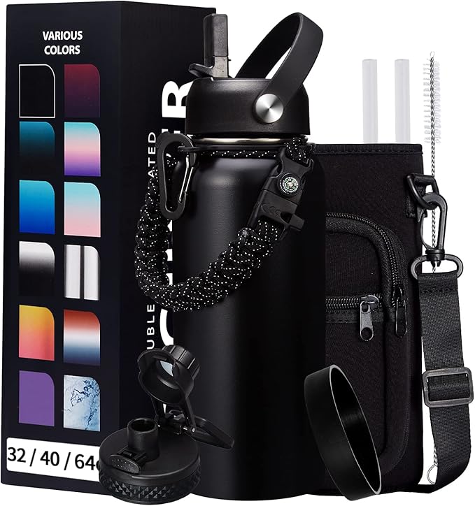 - SUPER JOYFUL COMBO: Buy 32oz insulated water bottles and get 9 accessories (2 x lids, 1 x survival paracord, 1 x carrying pouch, 1 x shoulder strap, 1 x protective cup mat, 2 x straws, 1 x straw brush). WITH A LIFETIME GUARANTEE, these thermal water bottles are perfect gifts for using at home, work, school, road trips, hiking, sporting events, or just hanging out
